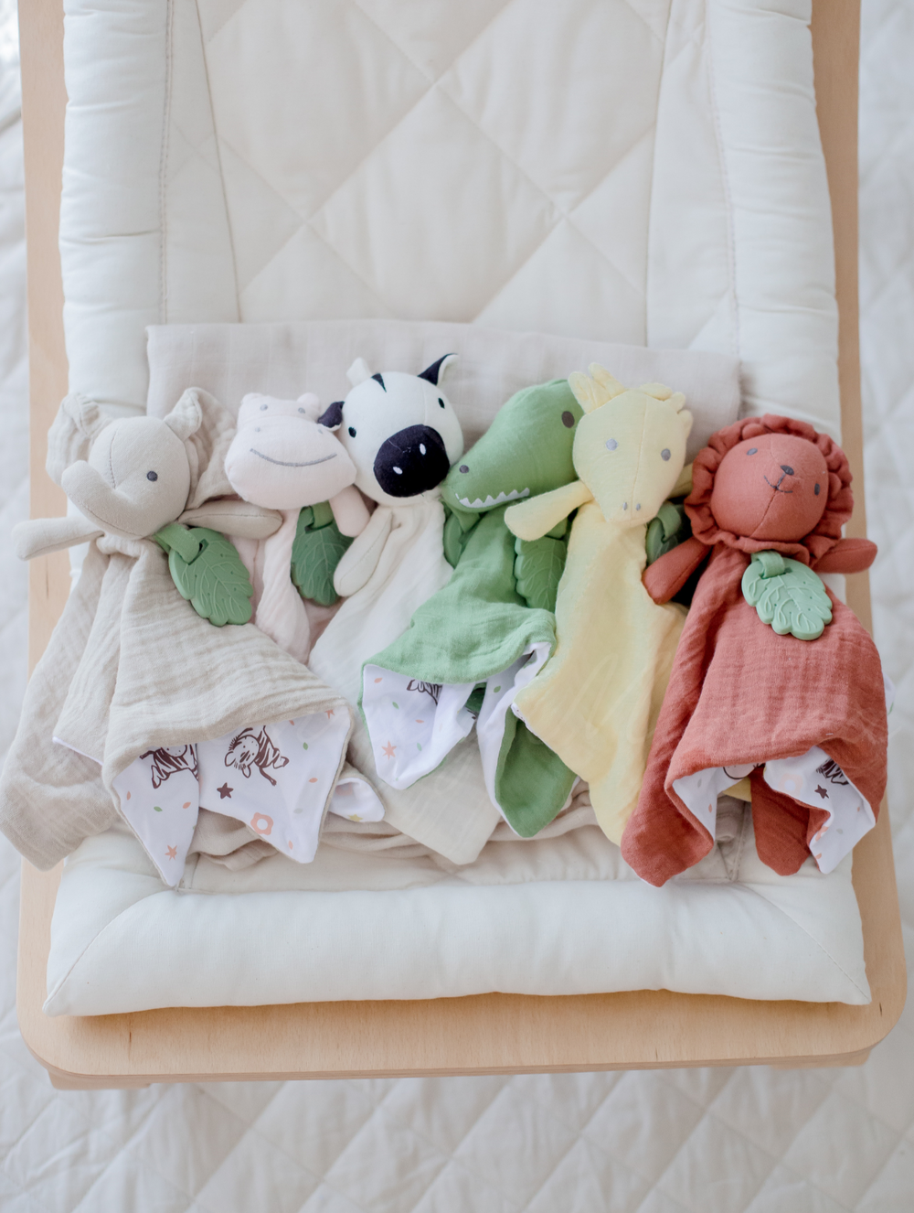 Introducing the cuddly and gentle organic zoo friends comforters. These adorable organic comfort toys are certain to become your child's beloved companion. Each comforter has a plush head, tiny arms for cuddling, and a rubber leaf for soothing teething gums.