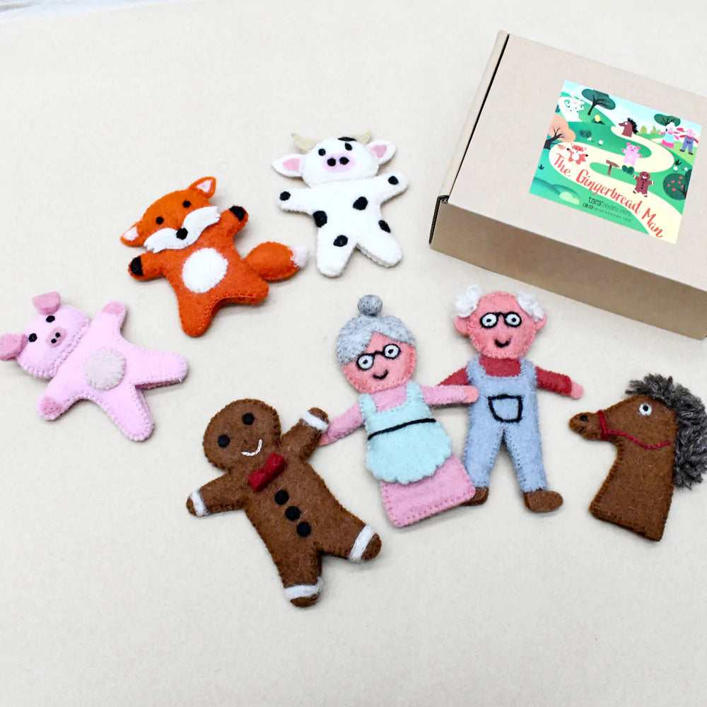The Gingerbread Man Story is a fairy tale told since the 19th century. They now come to life in the form of felt finger puppets - the Old Man, Old Woman, Gingerbread Man, Pig, Cow, Horse and the Crafty Fox.
