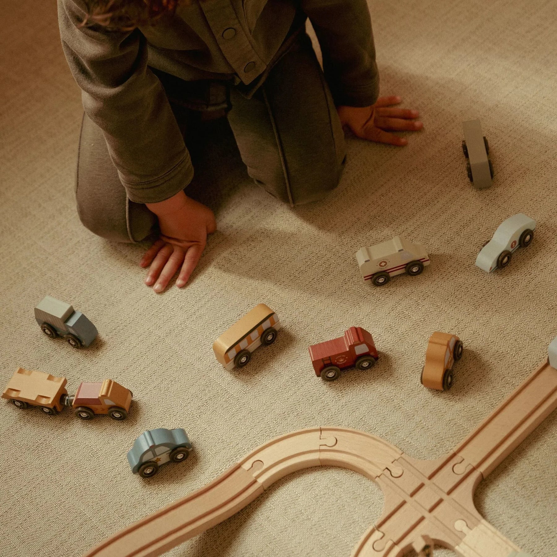 The city is always on the move! These wooden business and emergency vehicles are ready for action and effortlessly drive over the tracks to provide assistance where needed. Let the fire brigade respond, the police patrol, or the truck deliver goods. Designed for endless playtime with the Little Dutch Train Track XL and the expansion sets. Combine and create your own adventurous city!