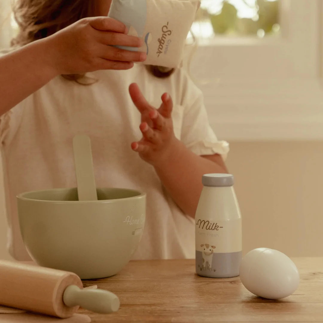 Time to bake something delicious! With this wooden baking set, little bakers learn all about preparing delicious cookies and pastries. The set includes a recipe card and all the essentials, such as a mixing bowl, baking tray with cookies, toppings, an egg, butter, flour, sugar, milk, and even colorful sprinkles. Roll out the felt dough with the rolling pin and decorate the cookies as desired. The perfect set for endless playtime fun in the play kitchen!