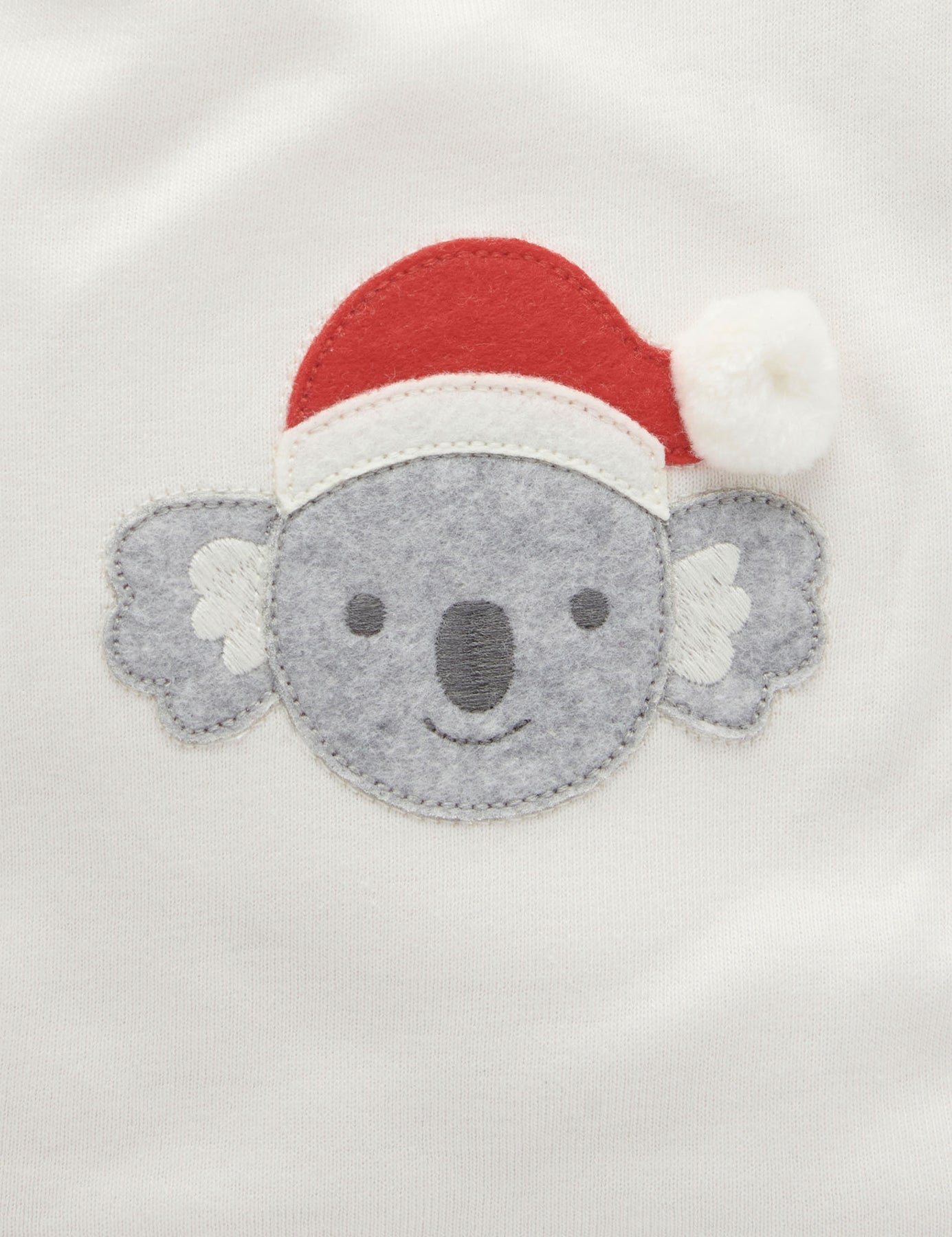 Santa Hat with pom pom and elasticated ribbed trim Elf Booties with ribbed fold over cuff and fluffy pom pom Santa Bib with koala applique, absorbent towelling backing and adjustable snap clips Made from 100% Certified Organic Cotton