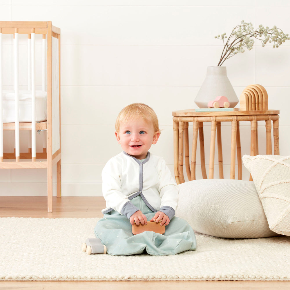 The baby Arm Warmers are a bolero style jacket, designed to be used over the top of any arms-out sleeping Swaddle, Sleeping Bag, Sleep Suit or Sleep Onesie. If your baby is wearing a sleeveless sleeping bag, you may notice their arms feeling cool during the coldest hours of the night. If this is causing them to wake, a little more warmth on the arms may be needed. The sleeves on the Arm Warmers are rated 1.0 TOG making them suitable as a mid-weight layer, and the foldover cuffs will help keep hands warm too.
