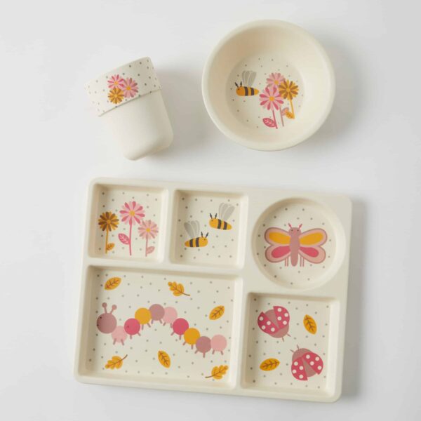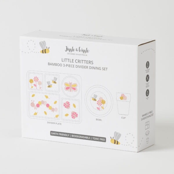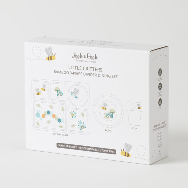 Make mealtime fun for little ones with this adorable eco-friendly bamboo fibre Kids 3 Piece Dining Set! This bamboo dining set is a perfect alternative to traditional plastic or fragile dish-ware for kids. The Little Critters Bamboo Divider Dining Set includes a child-sized plate, bowl, and cup featuring our favourite insects!
