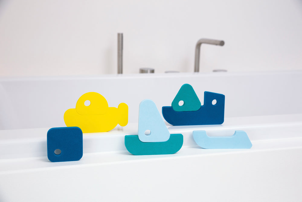 Ready to embark on a wonderful adventure? Have fun in the bath by matching the correct parts together and discover our cute litte boats: a submarine, a sailing boat, a catamaran and a cargo boat. Or even funnier, go crazy and invent completely new types of boats! Matching shapes and colors will improve your little one?s fine motor skills. This set includes 8 large EVA (soft foam) parts. The shapes float on water and you can easily stick the wet figures to the side of the tub or shower to make your own creations.