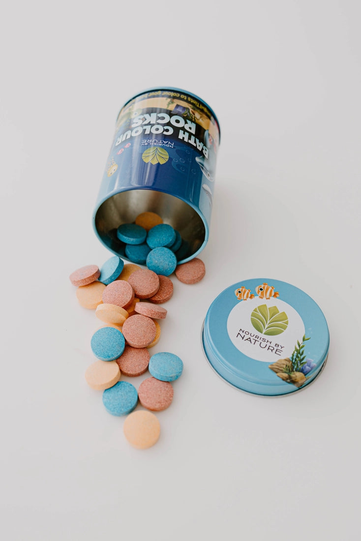 1 x Tin of Bath Colour Rocks (30 rocks total: 10 red, 10 yellow, 10 blue)