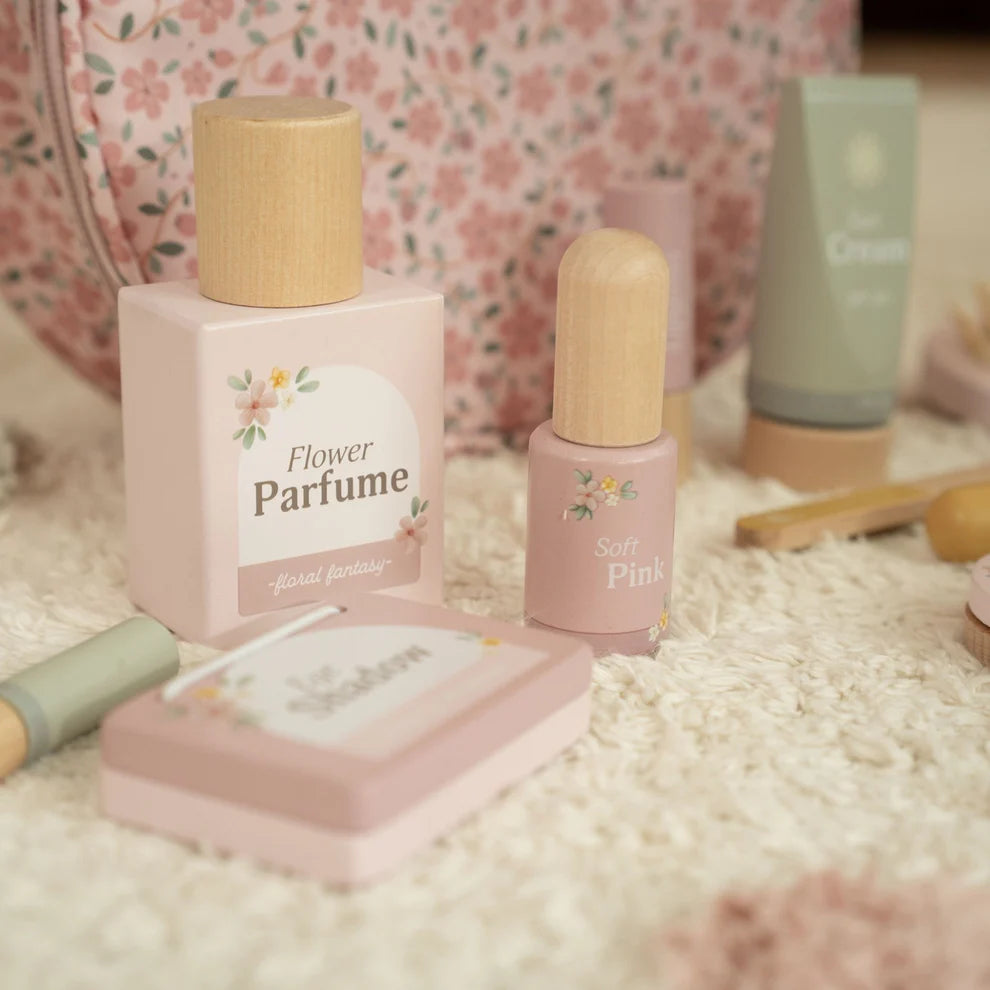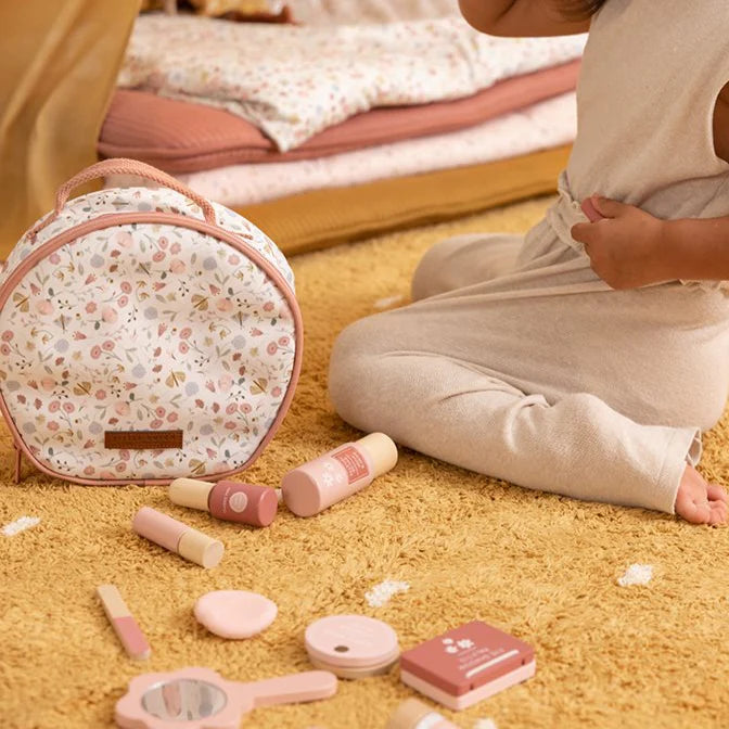 With this beautiful wooden make-up set, your little one can play endlessly! The soft floral bag is filled with the most beautiful beauty products, such as a hand mirror, perfume bottle, lipstick, nail polish, and much more. The set is perfect for role-playing and imaginative play – without any mess!
